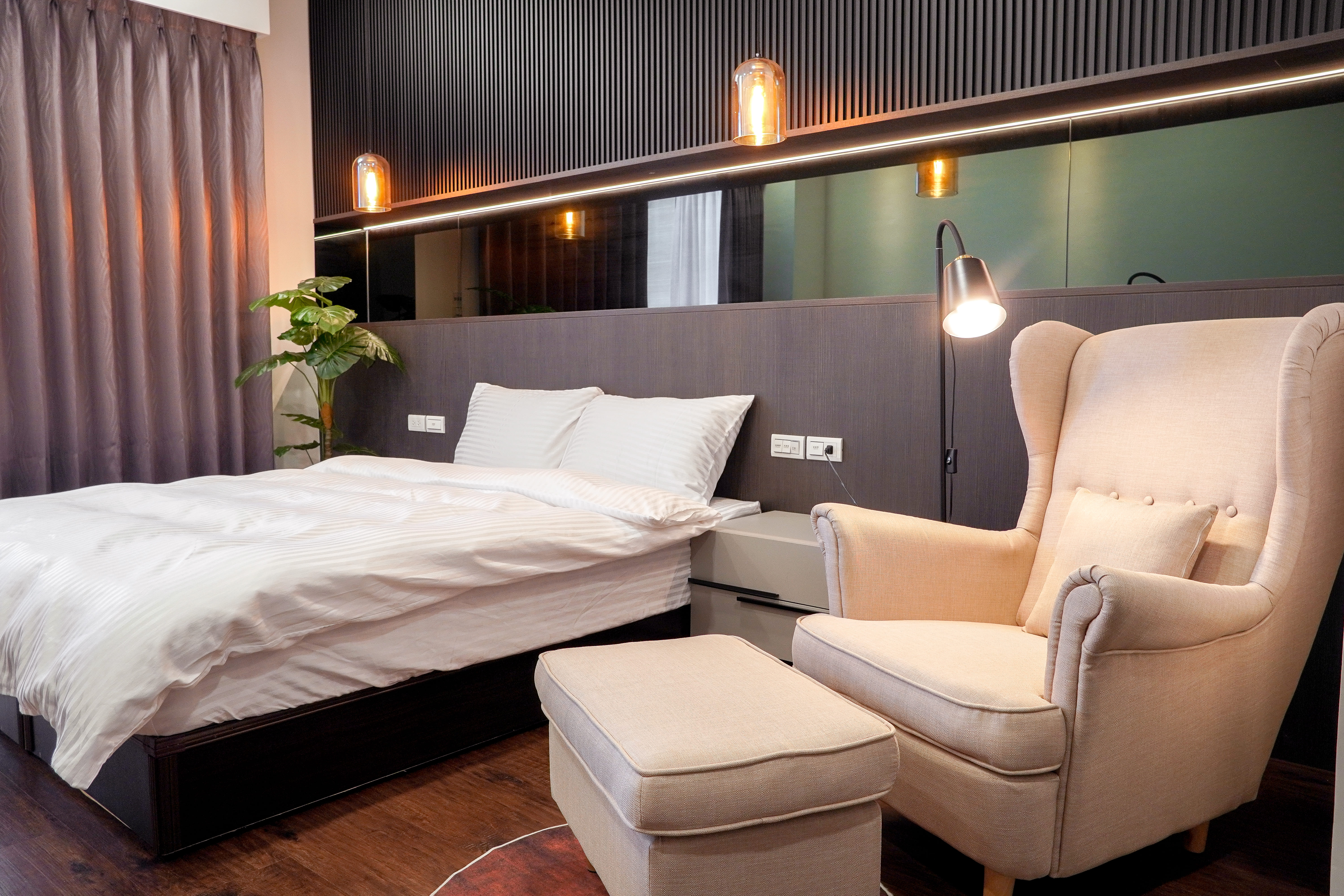 ✦ 房內設施:標準雙人床 1 張(5呎*6呎)、冷暖氣、吹風機、衛浴設備、Wifi、閱讀燈、單人沙發椅、衣櫃、露台涼椅